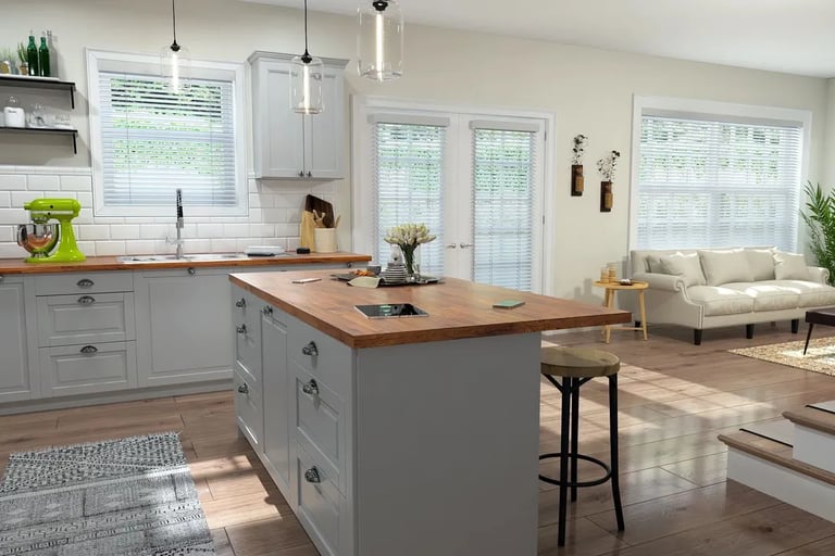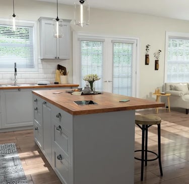 Kitchens: Faux-wood blinds or composite shutters for durability and easy care.